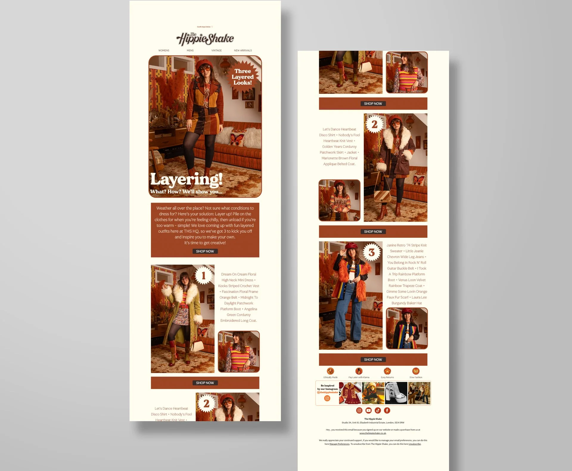 At the time of writing, since joining The Hippie Shake, I have designed over 200 emails for the brand, sending at least twice a week to their fast-growing customer base. For each design, I have complete autonomy and creative direction. I incorporate the branding I create for each collection, use campaign and studio images I have art directed, write all copy including subject line, preview text and top text, as well as photographing any additional images I need to convey the message of the email. Below is a small selection.